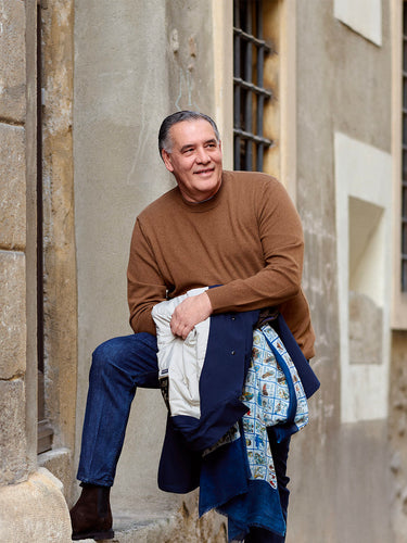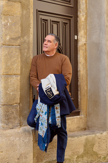Underneath, the Somali brown cashmere crew-neck pullover from Piacenza Cashmere adds depth and warmth, while the fringed printed cashmere scarf by Bontoni introduces a subtle play of color and pattern. Balanced with the selvedge denim jeans from Richard J. Brown, the look bridges casual ease and timeless tailoring.