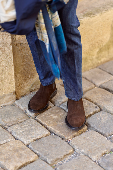 Grounded by brown waxed suede Chelsea boots from Common Projects and finished with dark brown cashmere-lined gloves from Bontoni, this ensemble reflects the quiet charm of a warm autumn day — where elegance meets the soul of the old town.