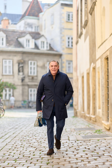 The navy blue parka jacket from Sealup brings clean lines and urban sophistication, perfectly suited for the cobblestone streets of the old town in autumn light.