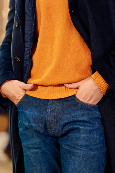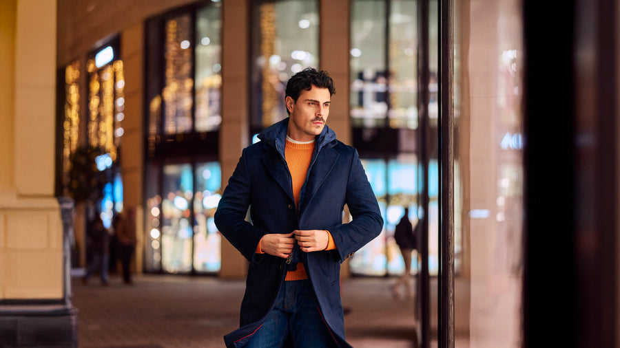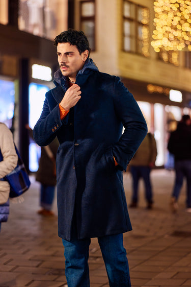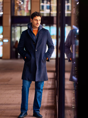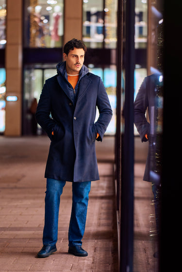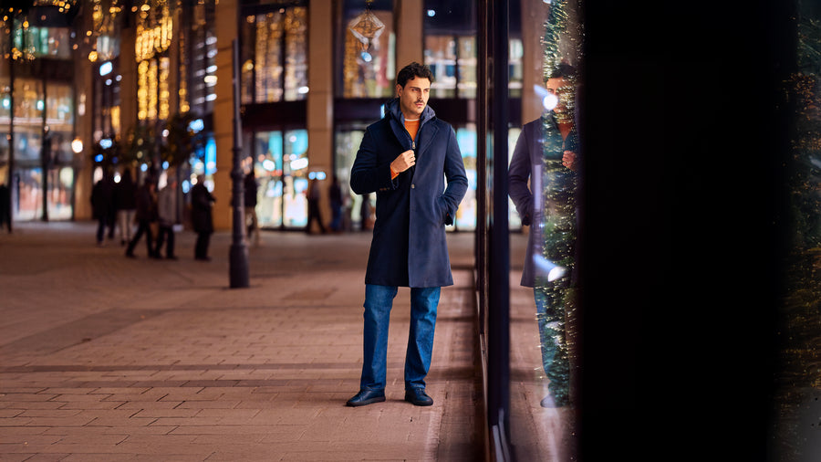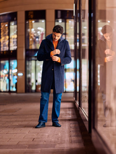 Anchoring the outfit is Kired’s dark-blue hooded coat with a detachable wind-protection insert—highly functional, quietly technical, and sharp in silhouette. Underneath, a Malo cashmere-blend crew-neck sweater adds warmth and a soft contrast in texture. Denim-blue stretch-cotton jeans by Marco Pescarolo keep the profile streamlined, while navy Common Projects “Achilles Sport Premium” leather sneakers finish the look with a minimal, contemporary edge.