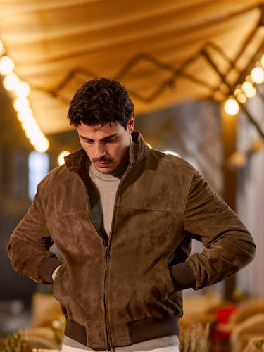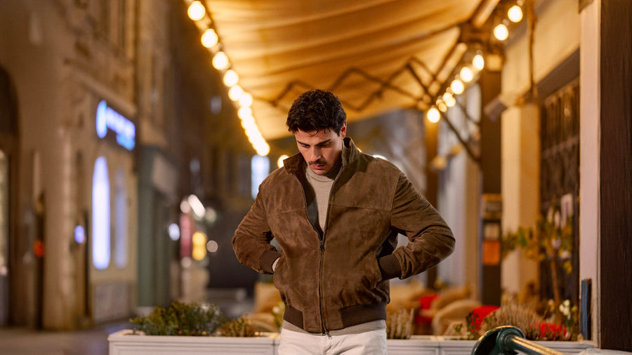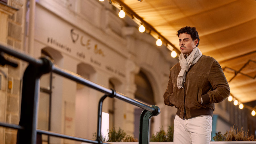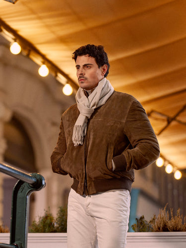 An Alfredo Rifugio beach-brown suede bomber sets a rich, tactile tone, layered over a Barba Napoli virgin wool turtleneck in soft greige for understated warmth and a refined neckline. Milk-white slim-fit cotton jeans from Richard J. Brown keep the silhouette crisp and modern, while a beige fringed cashmere scarf by Piacenza adds softness and movement. Finished with moka nubuck Common Projects “Achilles” sneakers, the look stays minimal, comfortable, and quietly polished.