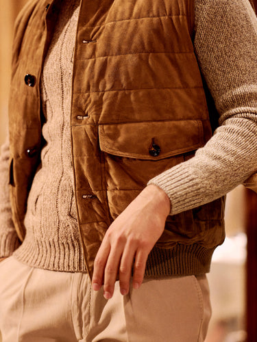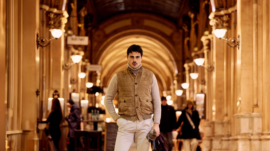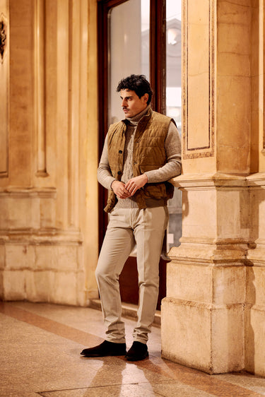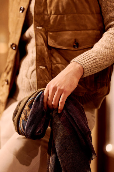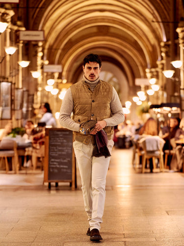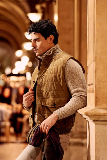 Kired’s taupe leather gilet sets the tone: understated, supple, and quietly confident—an easy statement piece that feels as refined as it looks. Layered over a beige Kiton cashmere turtleneck, the look leans into soft warmth and clean lines, with a subtle richness that reads instantly in the texture. A burgundy fringed cashmere scarf with a Ballon print by Bontoni brings depth and character, adding a quiet accent against the tonal base. Richard J. Brown’s beige slim-fit stretch-cotton trousers keep everything sharp and streamlined, while brown waxed suede Chelsea boots by Common Projects add a modern, grounded finish.