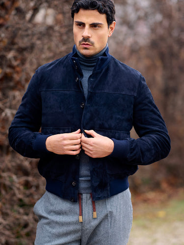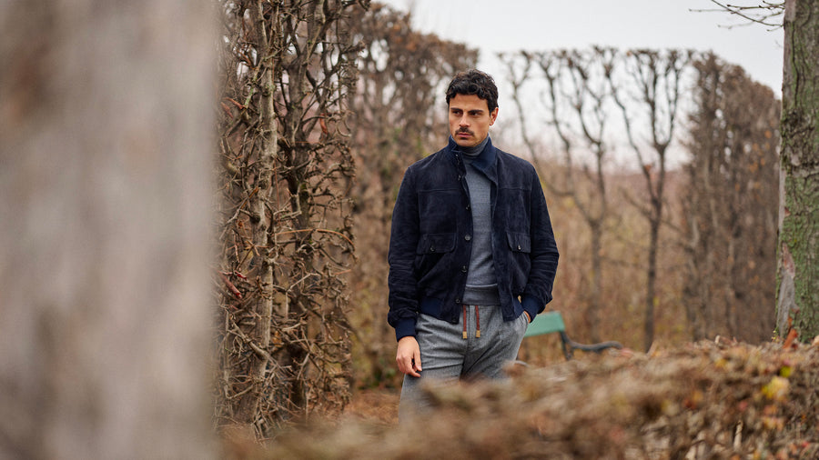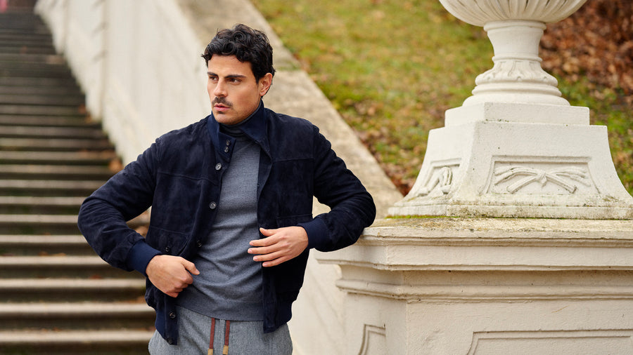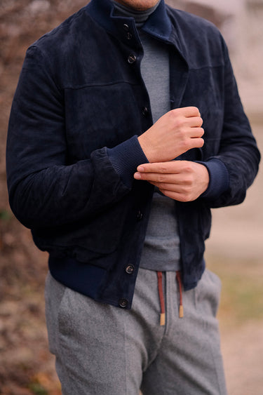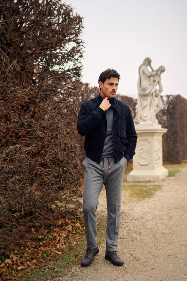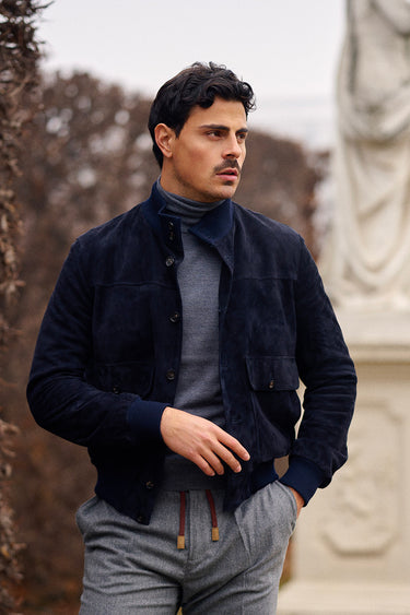 A refined smart-casual look built around quiet contrast: deep navy suede against soft grey melange. The button-up bomber adds texture and structure, while the virgin wool turtleneck keeps the lines clean and modern. Flannel drawstring trousers bring all-day comfort with a tailored attitude, finished with minimal charcoal nubuck sneakers for an understated, contemporary edge.